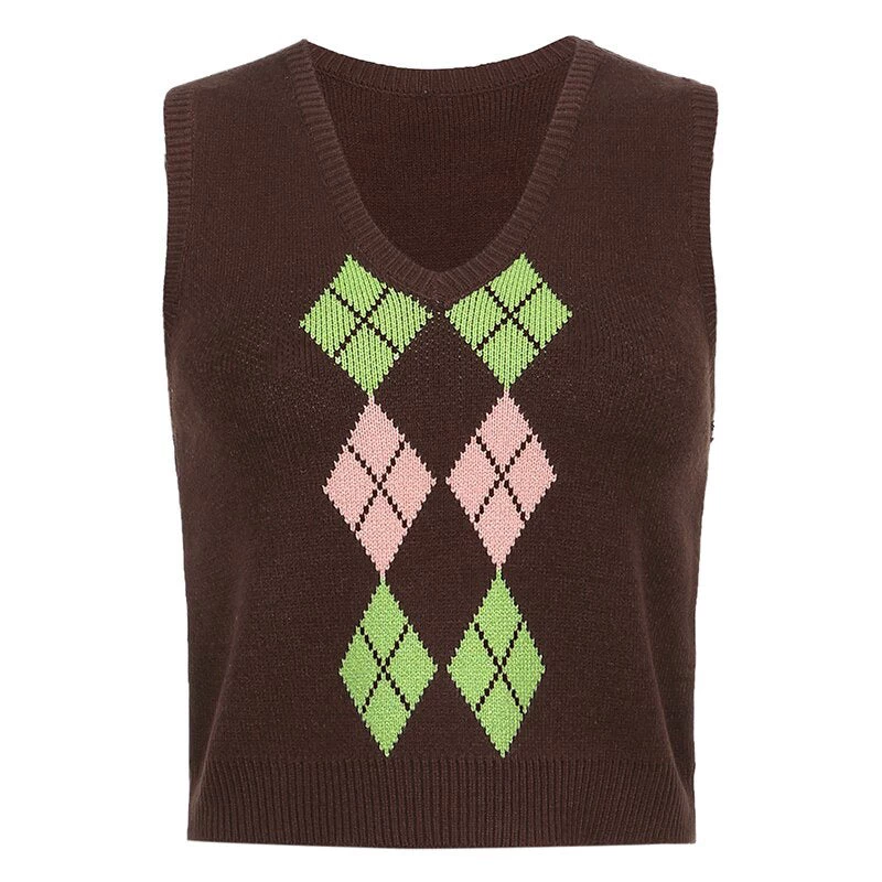 Aesthetic Brown Argyle Vest features a sleeveless design, a ribbed knit trim, a v neckline, and argyle pattern all over 🌼