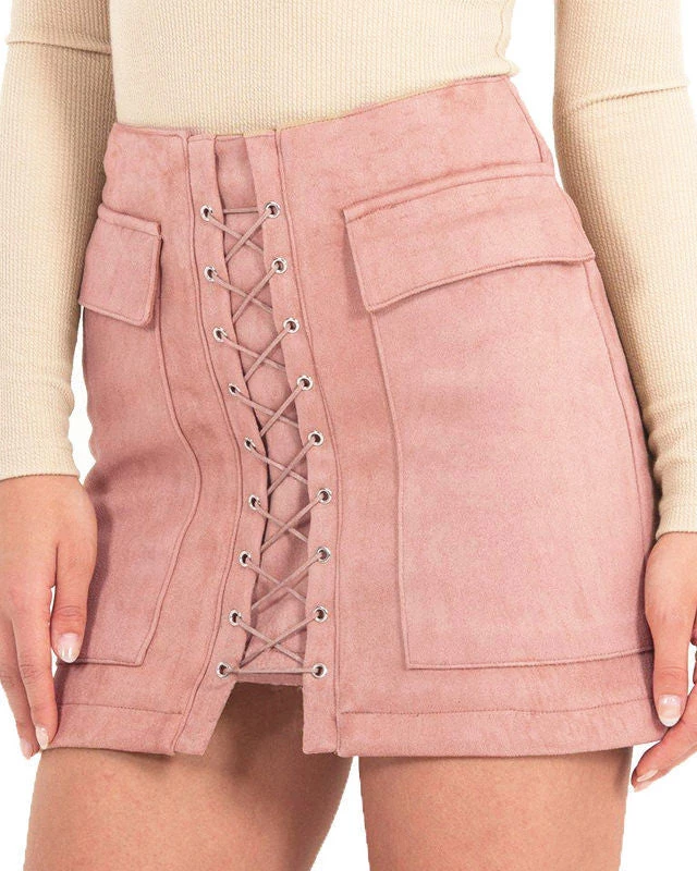 Boogzel Apparel Lace Up Faux Suede Mini Skirt Clothing