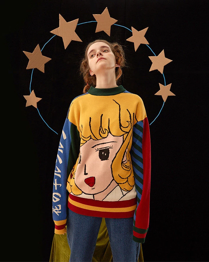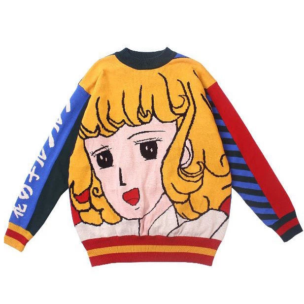 This cozy sweater features knit construction, relaxed fit and a cute old school anime graphic on the chest