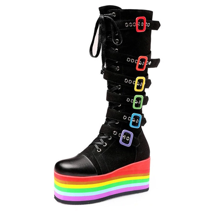 These aesthetic boots have a rainbow platform and buckle detailing with a zipper closure 🌈
