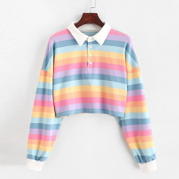 SKU: boogzel-apparel-4358563070021 Categories: Aesthetics, Clothing, OVER THE RAINBOW Tags: Boogzel, Crop top, Pastel, Rainbow Collared Top, Rainbow Sweatshirt, Rainbow T-shirt, Striped top, Stripes