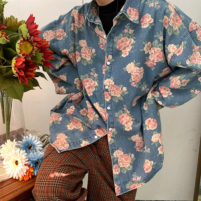 Boogzel Apparel Rose Print Denim Shirt COTTAGECORE / ARTSY