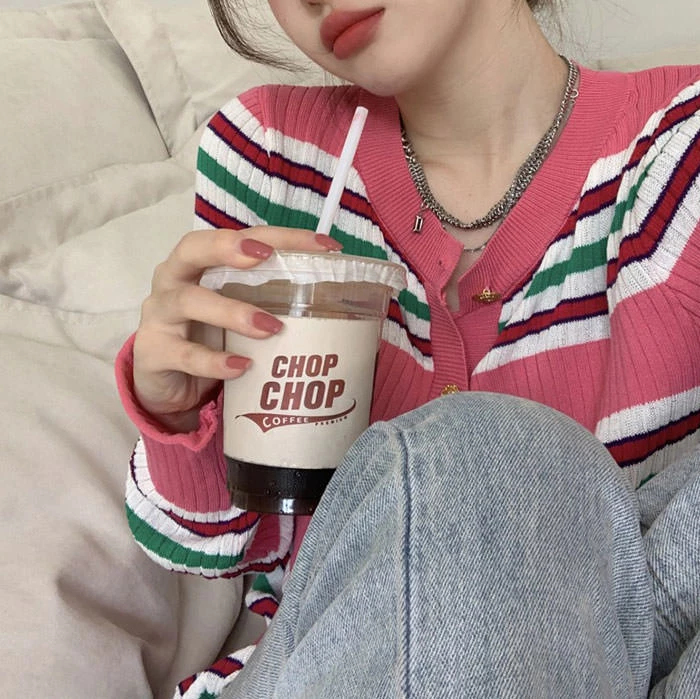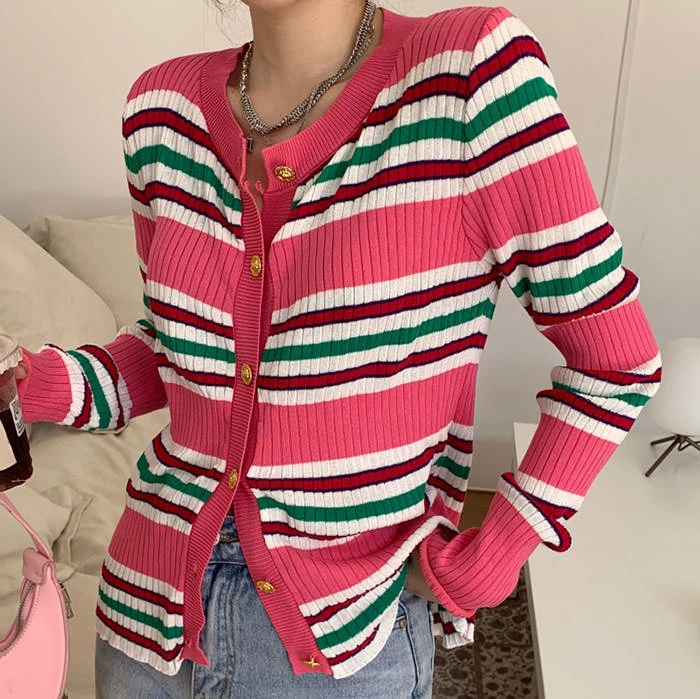 This aesthetic ribbed cardigan top has a button up closures and a pink stripe pattern all over 🌺