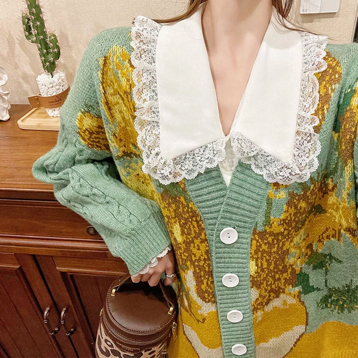 This long sleeve knit cardigan has ribbed trim, button closures on the front, and a Van Gogh Sunflowers print all over